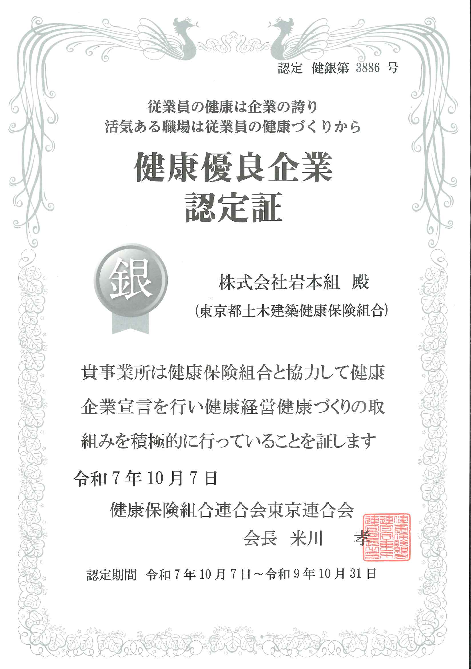 2025.10.23健康優良企業「銀の認定」取得のお知らせお知らせお知らせ弊社は、2025年2月13日に「健康企業宣言(銀の認定)」を行いました。全従業員で健康について考え・取り組んだ結果、取得することができました。 今後も、健康管理等に取組み、企業価値を高めるよう推進いたします。認定証